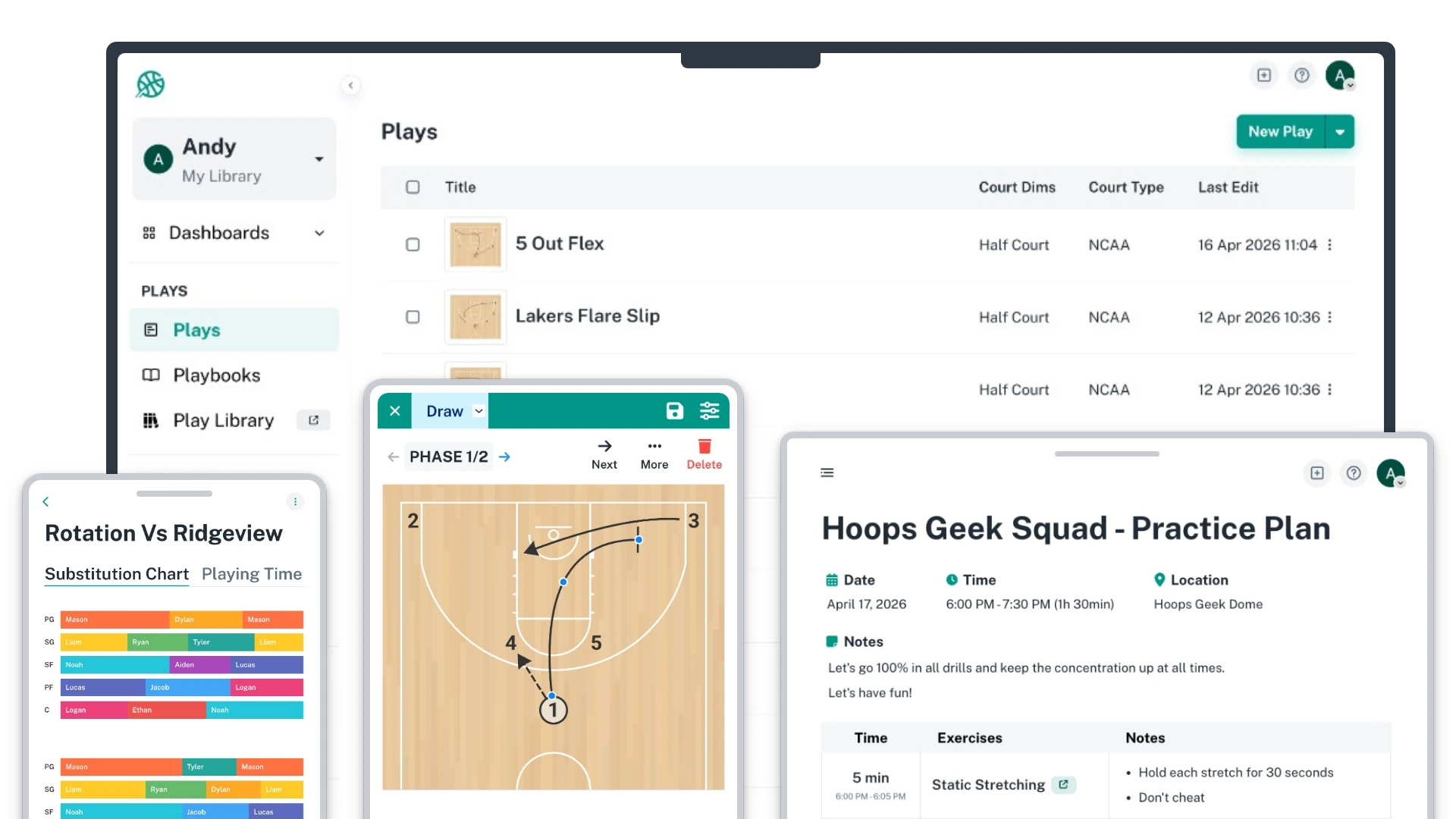 Create up to 5 plays, 1 playbook, 3 rotations, and 3 practice plans